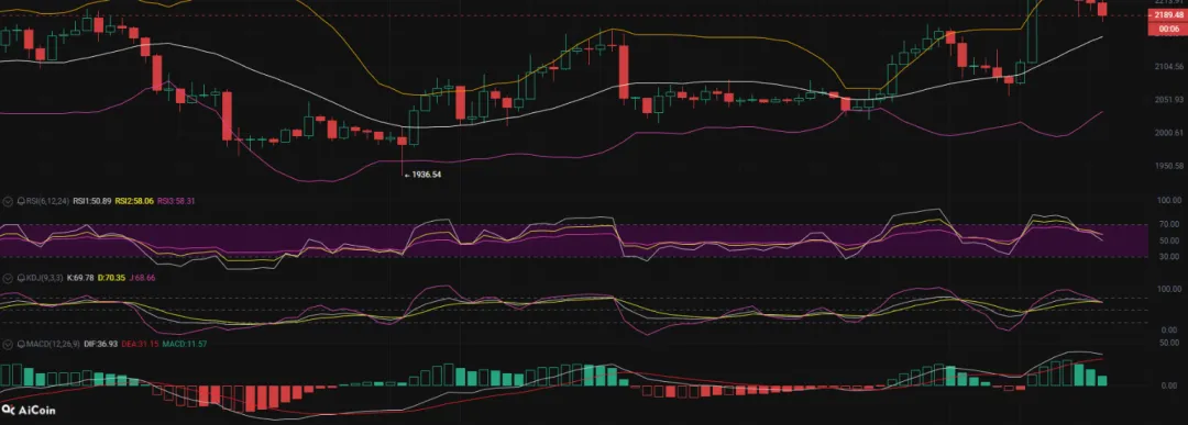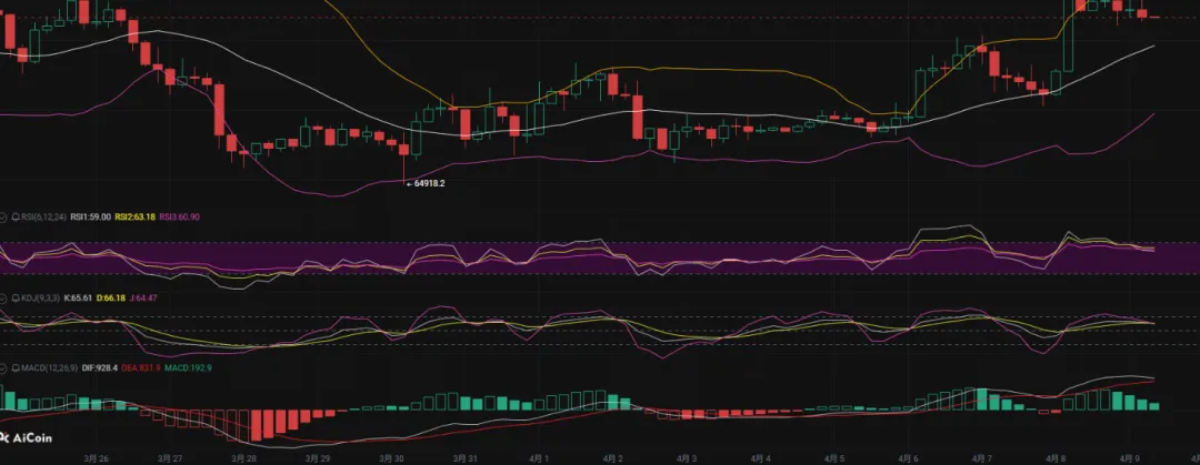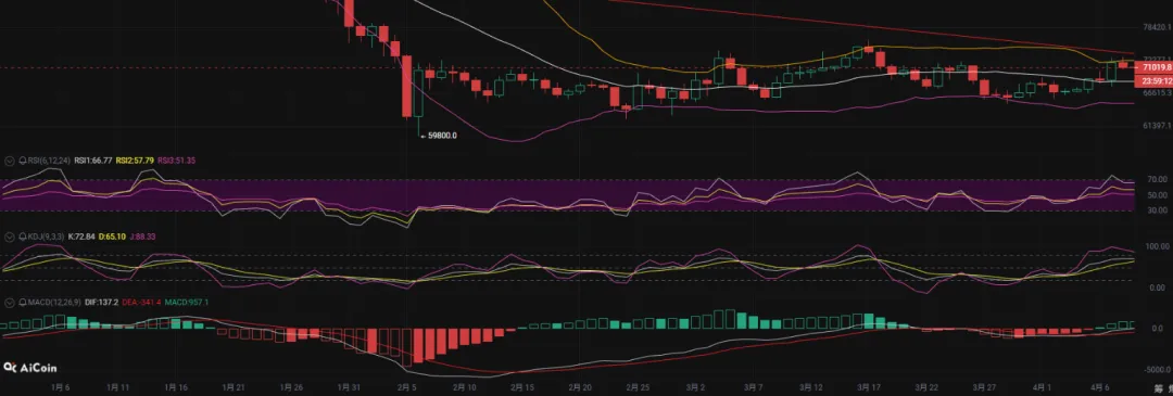 昨日比特币是延续涨幅,高位触及72858位置附近承压回调,晚间虽然回踩70600附近再度上攻,但是可惜并未企稳72000上方位置,行情是回调进入高位盘整。到今日价格进入宽幅震荡节奏,目前走势保持在7 万上方区域运行。日内多头情绪浓重,4 小时级别出现长上影线(72857 至 70707),显示72000 上方存在抛压。日线连续 3 天收出带长下影线的锤子线,68000附近形成强支撑。MACD:4 小时 DIF (951) 下穿 DEA (805)日线级别死叉但柱状体收缩EMA:价格跌破 7 日均线(70967)30 日均线(69385)构成动态支撑短周期小时图上看,布林带呈收口姿态,行情在中轨上方运行,多空双方较为胶着,目前行情偏向震荡,预计短时间日内格局不会有太大变化,大家操作维持高空低多即可。上方压制关注73500附近,下方支撑依次关注70200-69000。
