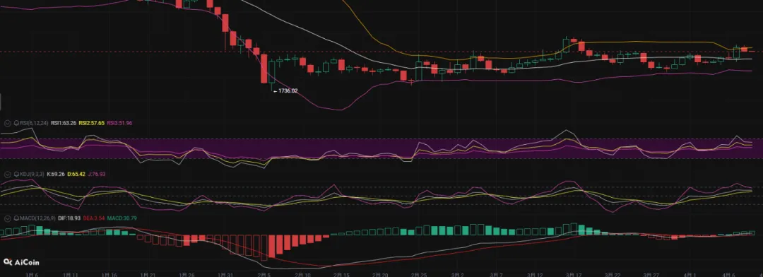 以太坊日内走势基本相似,只是跌幅略胜一筹,价格多次反弹在2233上方区域未能企稳后,行情也是迎来较强回落,目前在2185位置附近运行。短周期小时图上看,4 小时级别出现长上影线的阴线(04 月 08 日 20:00),显示2250 上方存在抛压。日线级别连续两日收带长下影线的 K 线,2133附近形成强支撑。MACD:4 小时级别 DIF (36.9) 仍高于 DEA (31.11),但柱状体缩量日线级别金叉后首次出现红柱后续若是能够突破2282一线短期压制,价格还有冲击日内高位的可能;反之短期一旦上攻受阻,后续预计还有回撤支撑的可能。目前行情偏向下行,各位顺趋势操作。下方关键支撑关注2130一线。