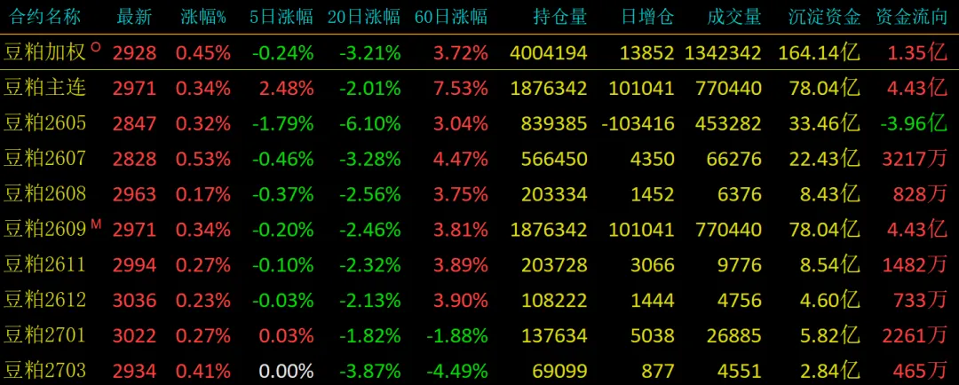 豆粕2605:期现差-31点,期权剩8天,期货剩余21天豆粕2609:期现差11点,期权剩131天,看涨持仓3186手,看跌持仓24181手。期货剩4个月21天,持仓量187.63万手。去年同期241.6万手,收盘3074(最高261万手,4月9日-5月20日跌307点3168-2861今日盘面:收盘2972,开盘2962,最高2981,最低2954,结算2970。增仓10.10万手+9点,成交77.04万手波动27点,换手41%,上下影阳k线,5震荡形态。价格10均线下,macd空头转弱,下方5和60均线支撑。前20增仓偏空,前5增仓偏空。昨日盘面:收盘2962,开盘2963,最高2984,最低2943,结算2961。增仓8.98万手-1点,成交77.8万手波动41点,换手44%,上下影阴十字k线,4震荡形态。价格40均线下,macd空头强,下方5和60均线支撑。前20增仓偏空,前5增仓偏空。今日总结:今日盘面震荡小幅上涨,连续几日小区间震荡,移仓换月的时间点,多空都增仓,短线看库存下降,4月看到港节奏,5月供应增加看成本支撑,看美豆种植进度天气变化,短线看区间震荡2900-2935-3000美伊谈判又存变数,对原油价格影响较大,间接影响豆油价格,如果豆油价格下跌,那豆粕的支撑会强。1、川普5月中旬是否成功访华,以及美豆的情绪炒作和美豆采购计划7、美伊以地缘冲突对宏观影响(原油影响生物柴油需求运费上涨等)以上内容仅供参考,不构成任何投资建议,市场有风险,投资需谨慎!