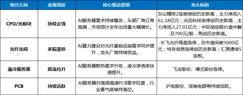 1. 领涨主线:算力硬件——CPO、光纤、液冷全线走强