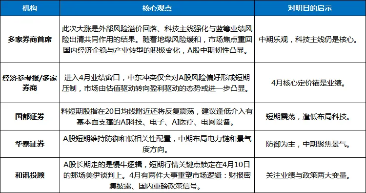 对于投资者而言,4月市场的关键词已从“地缘博弈”切换为“业绩验证”。多家券商策略认为,进入4月业绩窗口,A股市场由估值驱动转向盈利驱动的态势或进一步凸显。随着地缘风险缓和,市场焦点重回国内经济企稳与产业转型的积极变化。