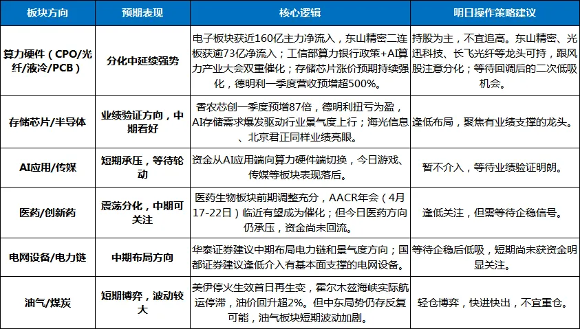 综合今日资金流向与机构观点,业绩验证窗口开启,算力硬件仍是当前资金共识最强的方向。明日操作中应坚持: