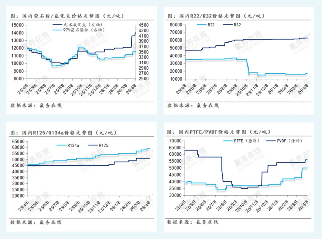 国内制冷剂多个品种价格提升,全氟己酮、R227ea市场受原料以及需求带动价格上行2000-5000元/吨。当前下游需求呈现结构性分化,一季度整体销量承压。国内空调企业3—4月排产略有回升,带动主力品种R32需求边际改善;R410a则受产品迭代替代影响,需求持续偏弱。外贸方面,受地缘冲突、海运受阻及订单交付延迟影响,一季度出口同比下滑,对整体市场形成拖累。尽管需求端表现偏弱,国内制冷剂企业暂无降价出货意愿,行业在成本与供给支撑下韧性较强。核心支撑来自供给端硬约束:2026年三代制冷剂生产配额已严格锁定,头部企业主动控量挺价,渠道库存偏低、货源偏紧,市场无集中抛售压力。同时上游原料价格持续上涨,成本支撑强劲,企业成本传导顺畅。当前行业供需格局稳固,配额管控为价格提供较强支撑,后续静待地缘冲突缓和,市场需求有望迎来修复性增长。