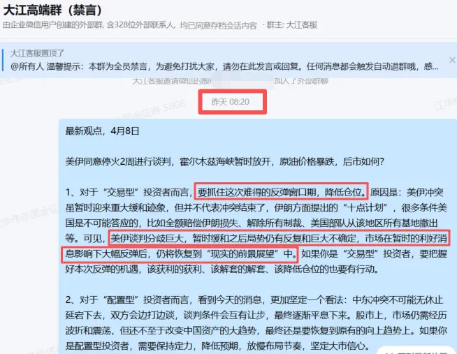 我们昨天说,中东局势虽有好转,但没那么容易达成协议,双方分歧巨大。要把握难得的反弹机遇降低仓位。特意在早盘开盘前发布群消息,早盘开盘前提前录制短视频并发布。