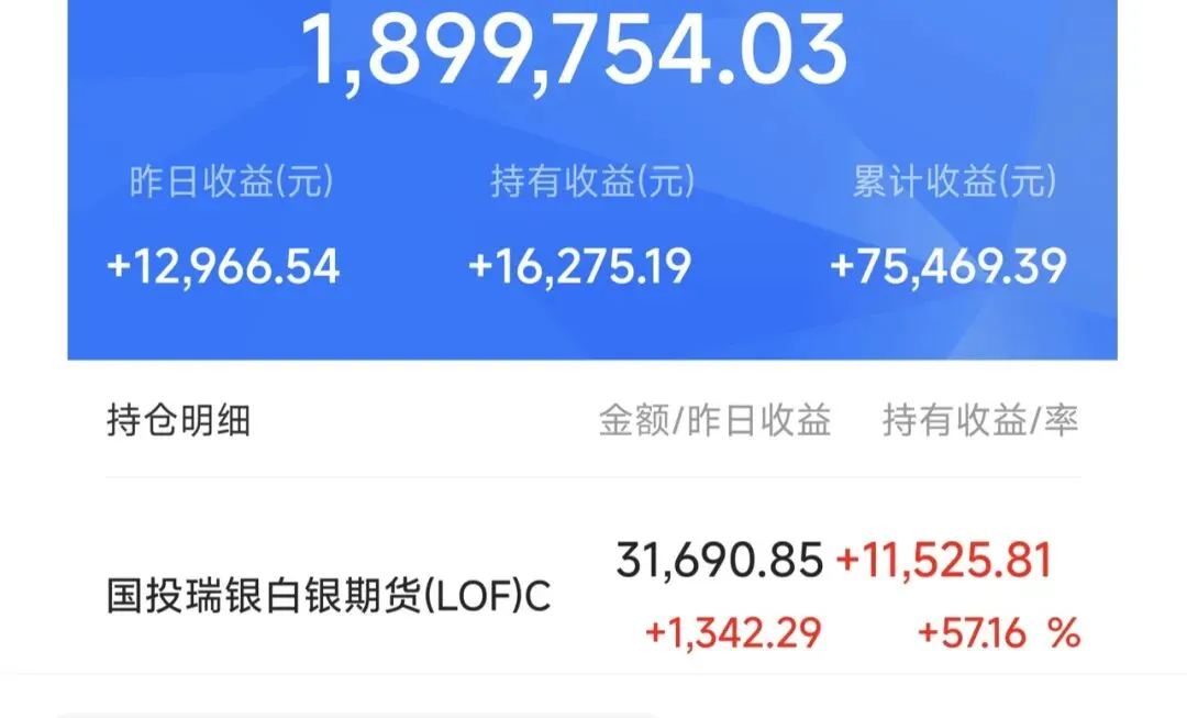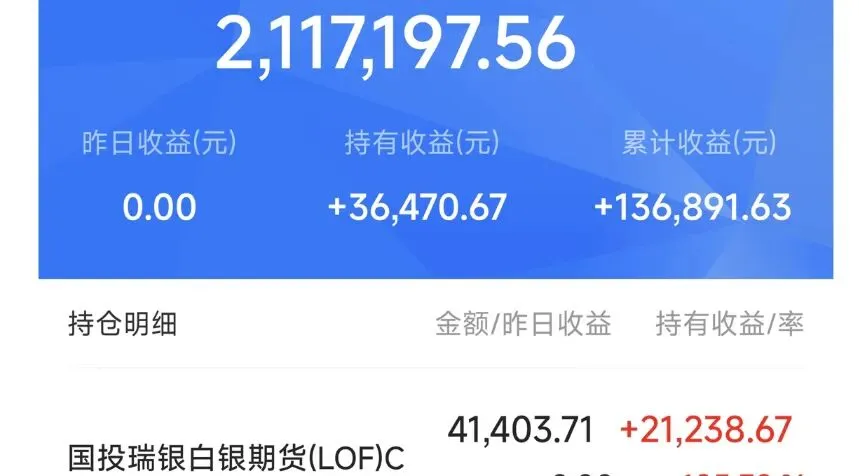 其中,国投瑞银白银期货(LOF)C 今天直接暴走,最新持仓金额41,403.71元,持有收益+21,238.67元,单日大涨近2%,直接给账户贡献了绝大部分收益,这波布局真的太值了!