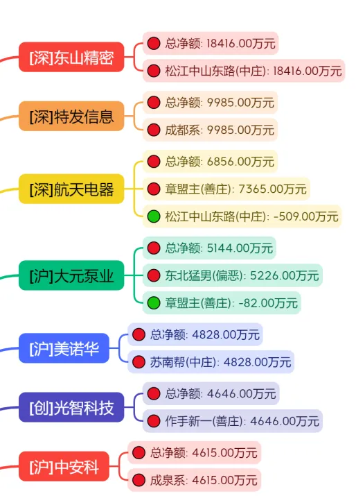 科技股成为游资共同关注焦点,东山精密、特发信息、航天电器等科技类股票吸引了松江中山东路、成都系、章盟主等多路资金介入。同时,东北猛男在多个中小盘股中持续布局,显示其对特定板块的偏好。