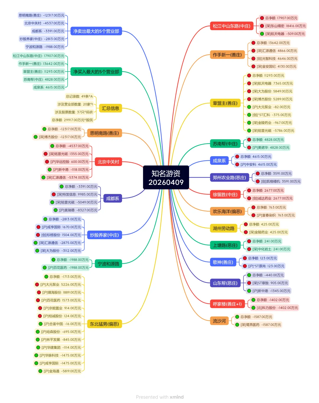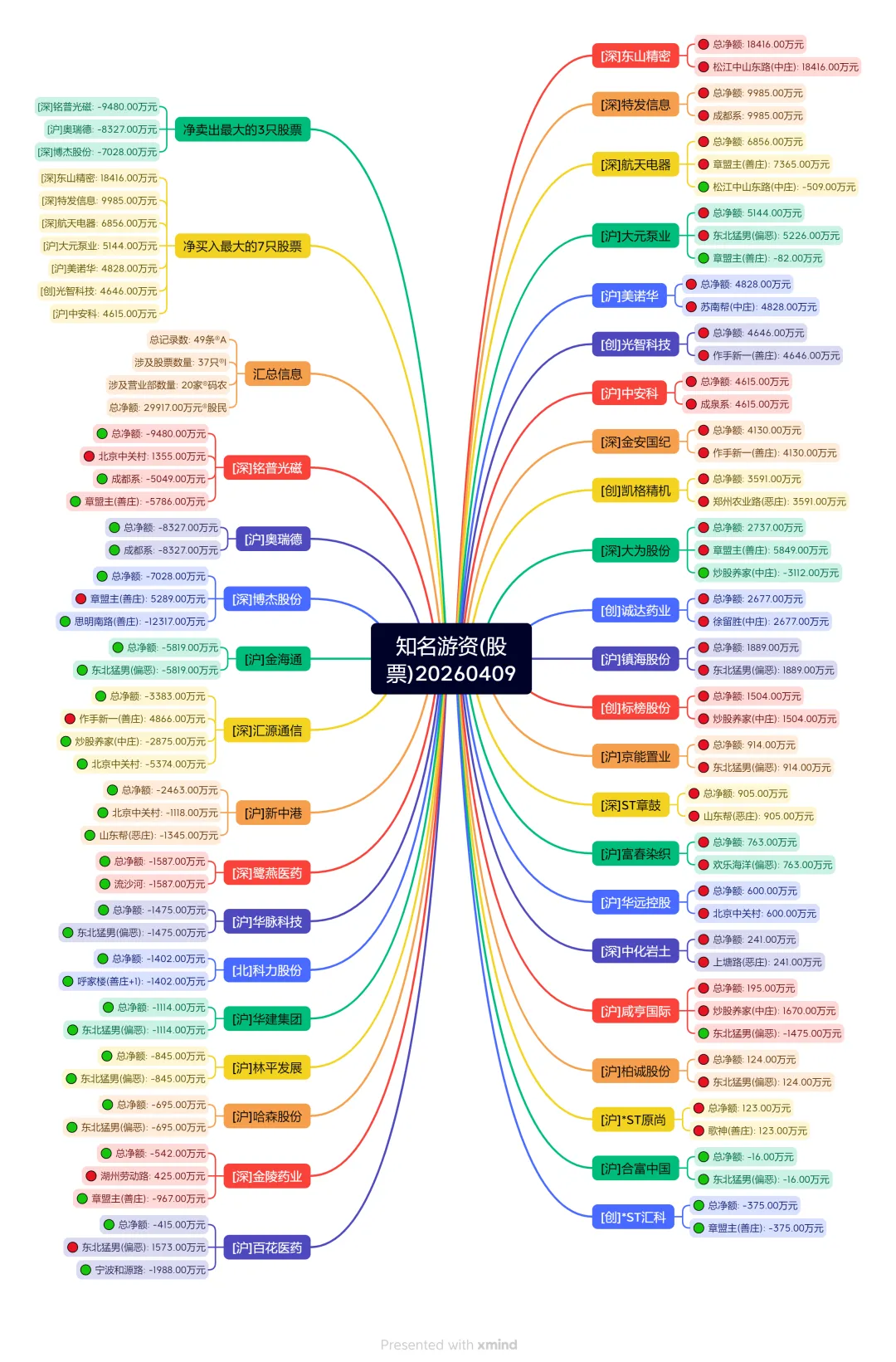 2026年4月9日,A股市场游资活跃度显著提升,龙虎榜总净额达29917.00万元,涉及37只股票和20家营业部。市场情绪呈现明显分化,科技股成为游资主要战场,章盟主、作手新一、东北猛男等知名游资在不同板块展开激烈博弈。