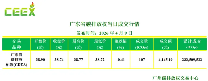 4月9日,广东碳市场碳配额(GDEA)成交107吨,成交金额4,145.19元,开盘价38.90元/吨,收盘价38.74元/吨,最高价38.77元/吨,最低价38.72元/吨,收盘价较前一交易日下跌0.41%。
