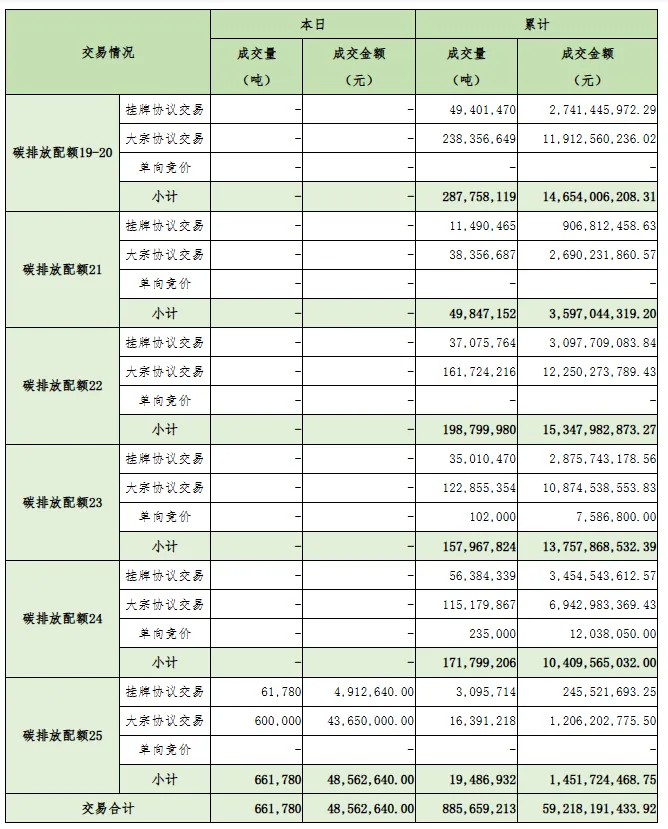 今日全国碳排放权交易市场成交总量661,780吨,成交总额48,562,640.00元,成交均价73.38元/吨。截至今日,全国碳排放权交易市场累计成交总量885,659,213吨,累计成交总额59,218,191,433.92元。