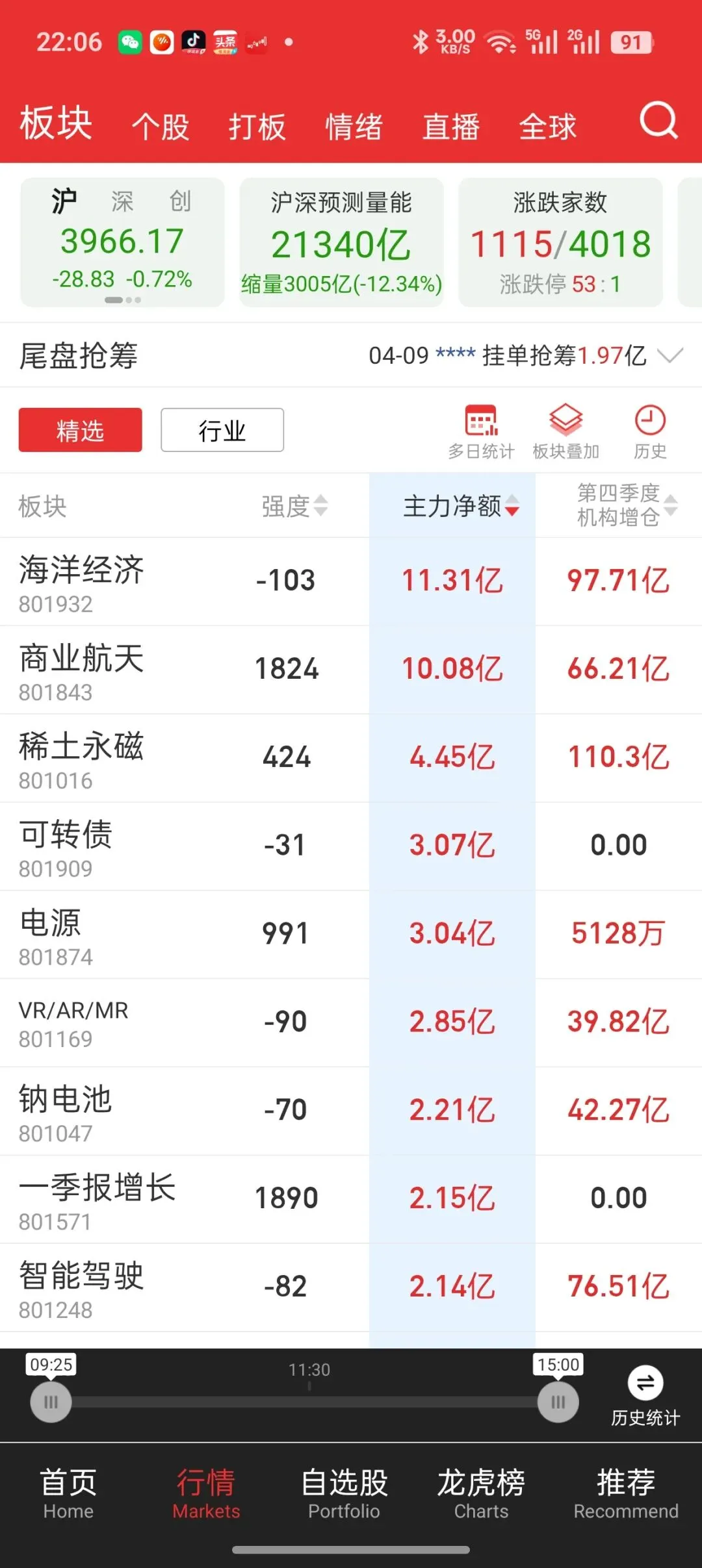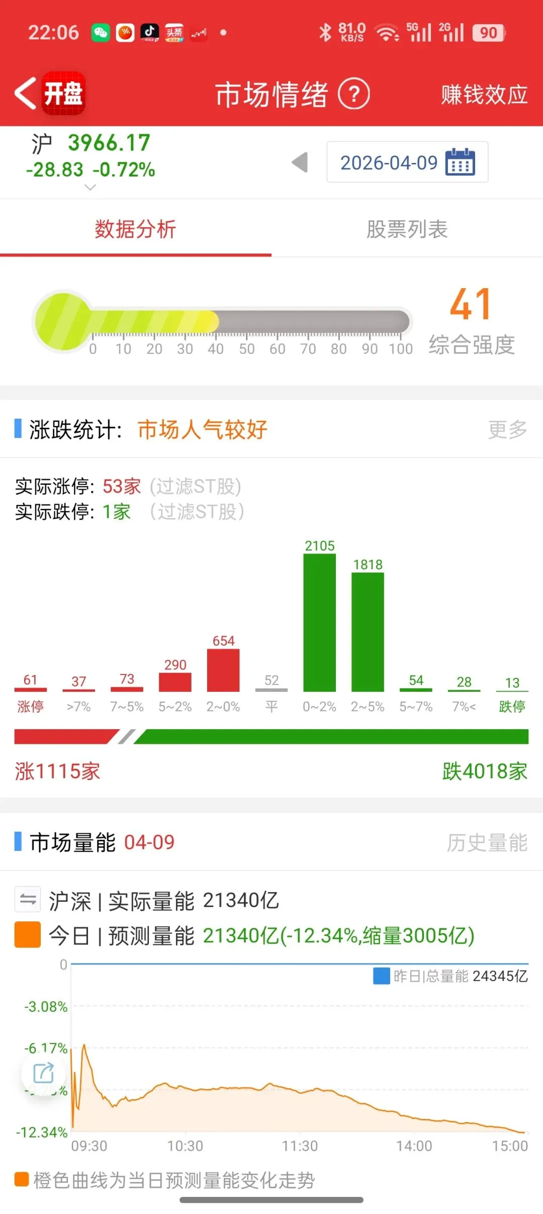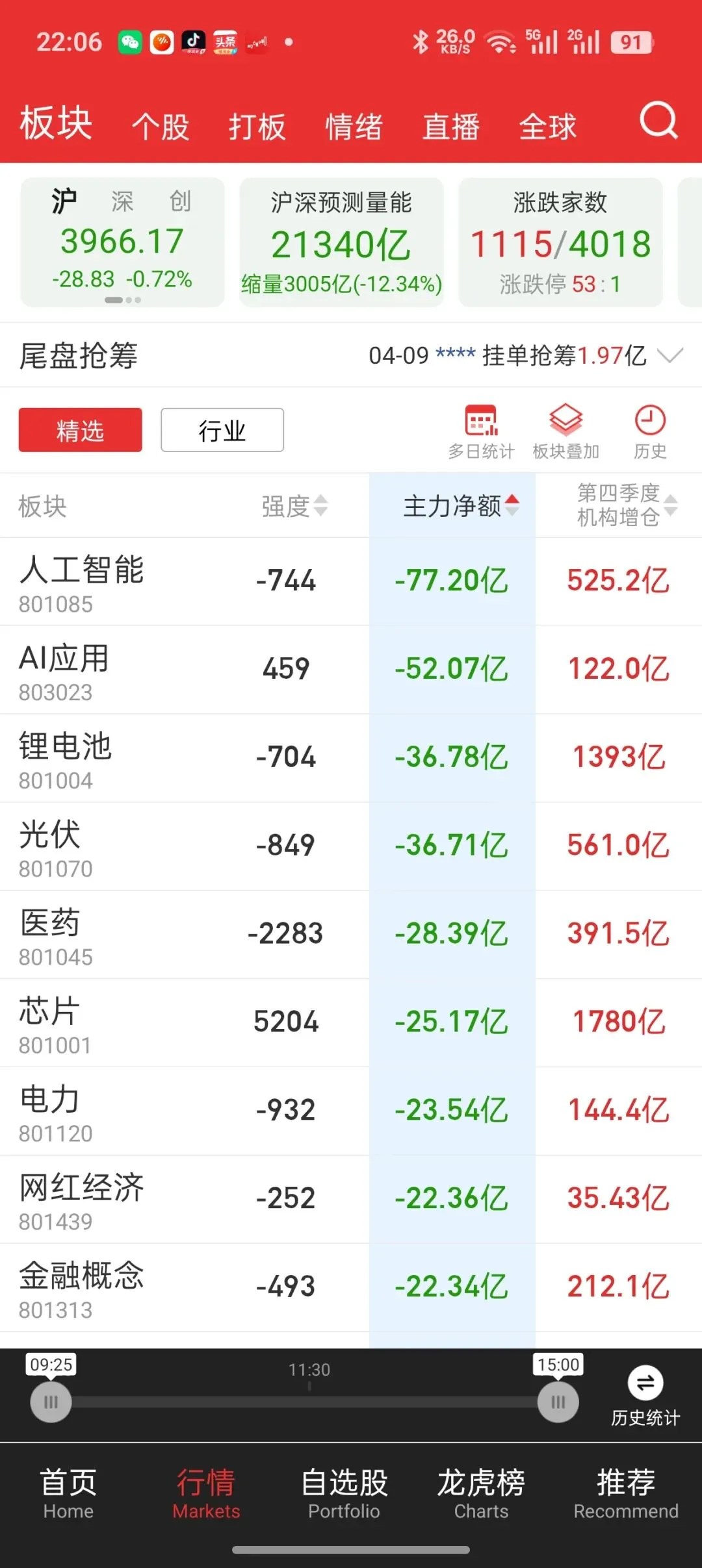 今日大盘缩量3005亿收于21340亿,下跌28点收于3966点,红绿盘比1115/4018,涨跌停比53/1。今天仍然受到中东局势影响,资金偏谨慎。昨日大幅放量上涨,今天缩量回调,总的来讲问题不大。今日通信板块跟芯片股涨幅居前,通信板块连续居于涨幅前列,后面行情应该可期,其他的持续性存疑。算力板块先涨的优先关注算力硬件,业绩会从这儿优先发酵。