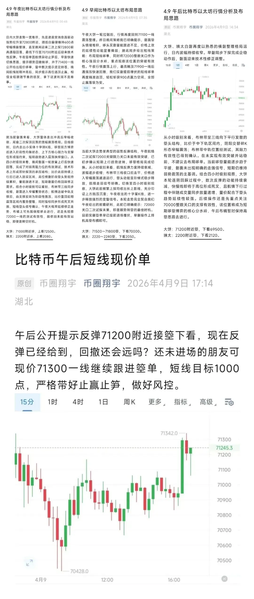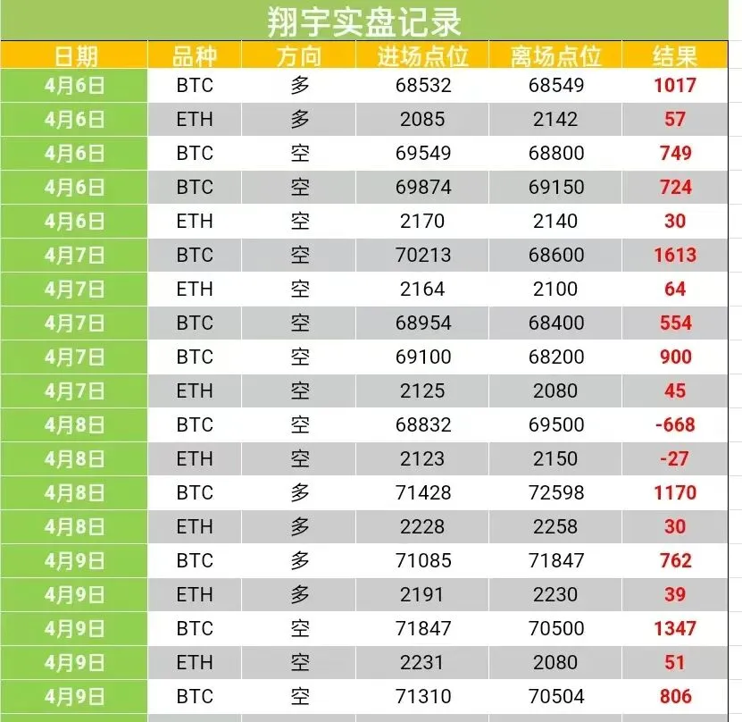 日内大饼走势还算符合预期。早磐到午后航情始终维持震荡节奏,比价两度下探70500一线均完成快速收复,支撑强度得到验证。直至晚间航情迎来变磐,暴力反抽比价重回72300附近运行。午夜时段我们通过磐中信号与量能结构精准锁定航情走弱拐点,果断将策略由哆转箜,日内公开给出三笔布局。三单全部精准踩中航情节奏,完美落袋,共计拿下大饼近3000点、姨太近百点的箜间。
