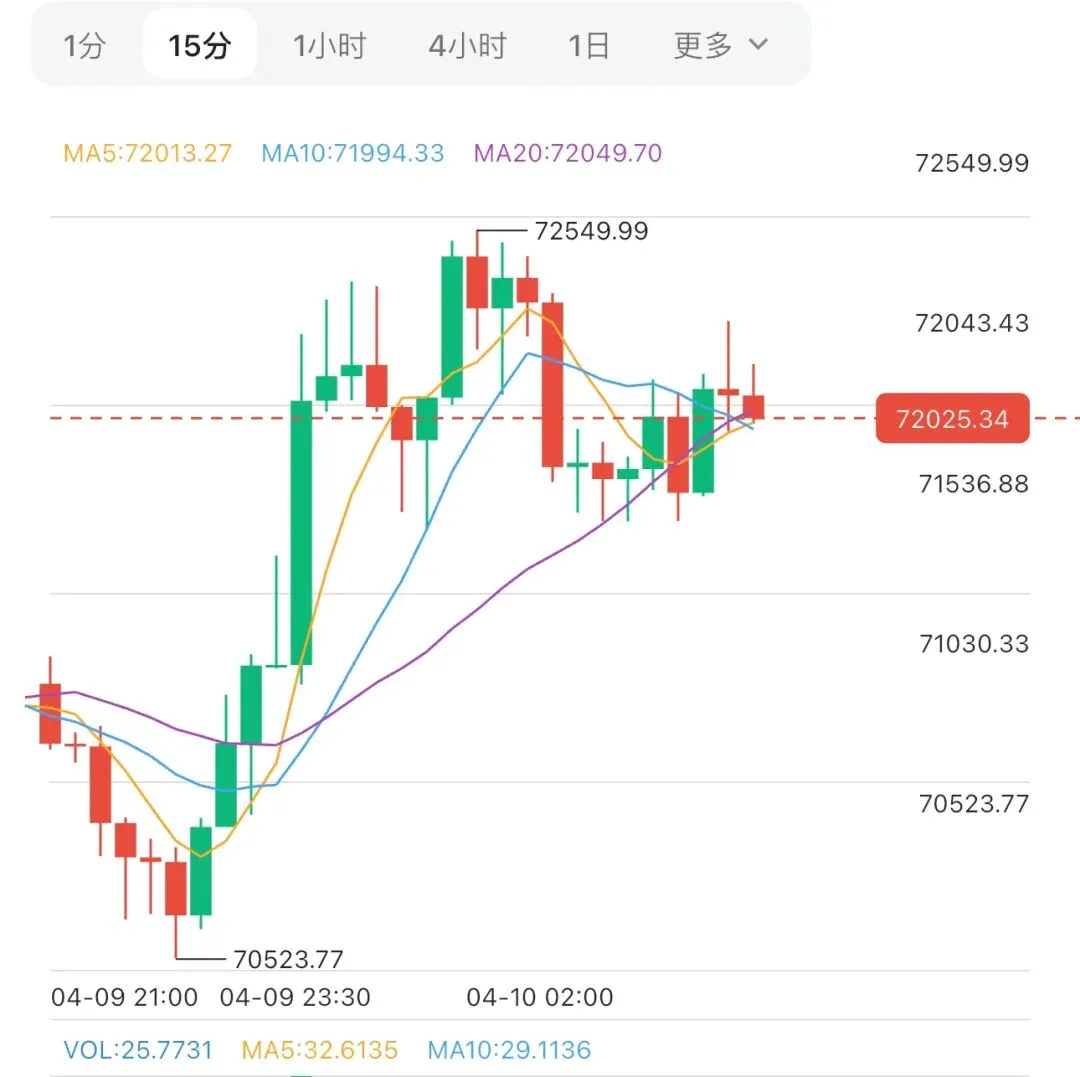 下方71500到71800北上,止损71000,目标看73000到73500破位看75000