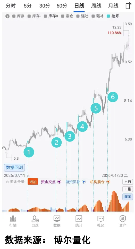 就比如下面这只股票,在2026年3月行情最为焦灼的这段时间当中,该股能够录得25%的涨幅是相当不容易,但是我们也可以发现股价在最后几天开始突破之前,其实一直处于反复拉扯的状态,所以相信很少有人会关注到,但是如果通过量化大数据,结合交易行为数据观察,就会发现其中的不一样了。