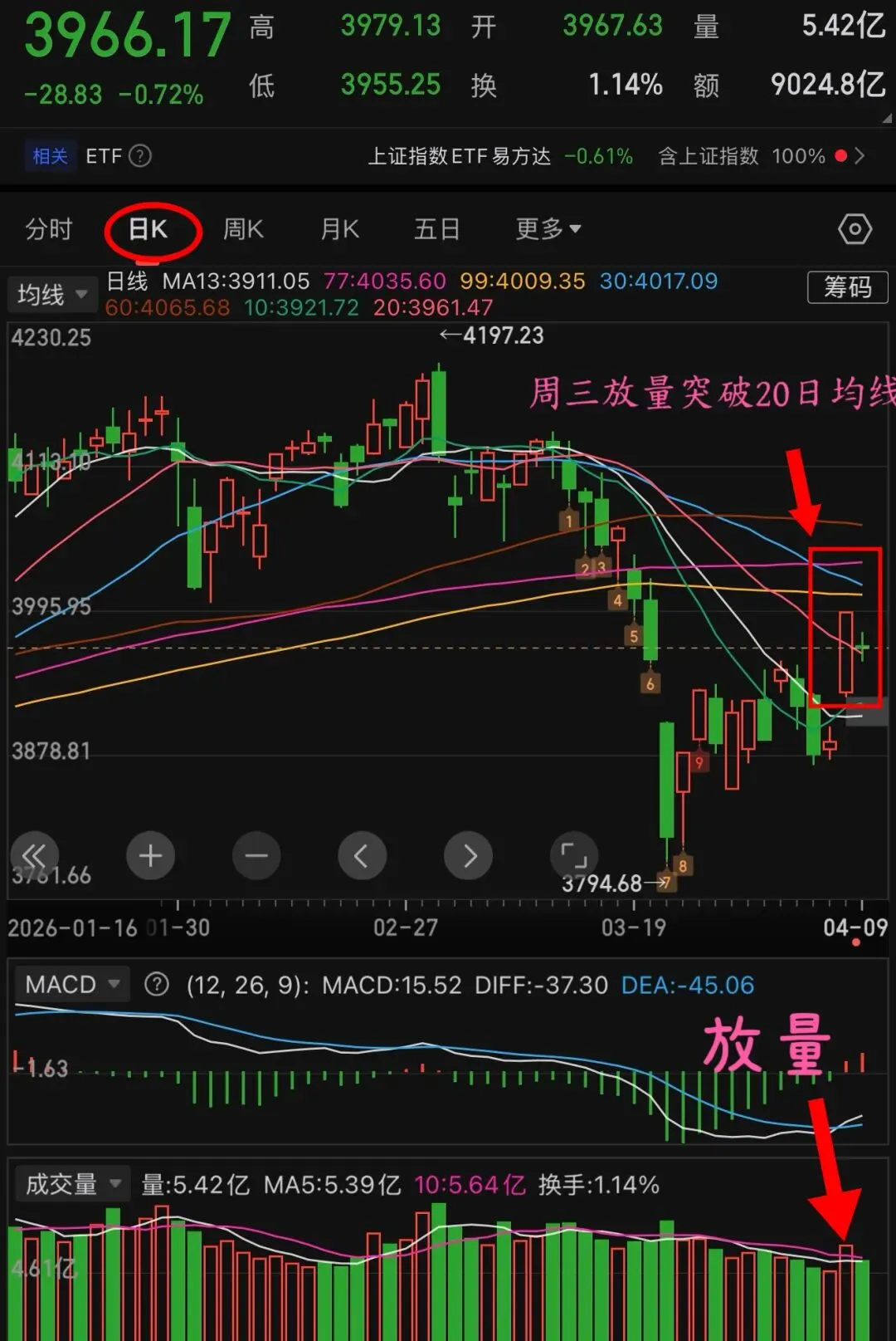 之所以这么说,从技术面就能看明白,周三沪指放量长阳突破20日均线(如下图),昨日盘中虽然一度跌破这一关键位置,但很快就被资金拉回,属于典型的获利盘回踩洗盘。昨天进场的8000亿增量资金,绝非短线套利,只是清洗掉短期浮筹,大盘依旧站稳5日、10日均线,根本没有大幅下跌的动力,完全是正常的技术性调整。