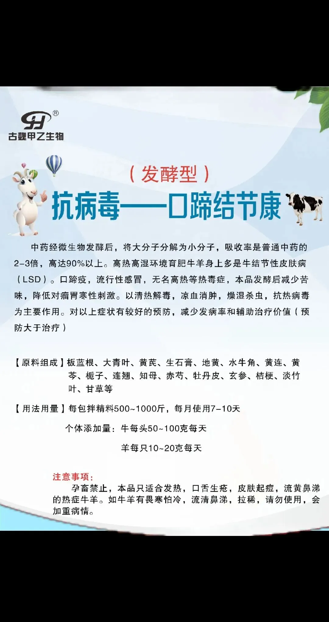 3、全群拌料或饮水添加发酵型牛羊暑湿清+口蹄结节康,增强免疫力,控制病情,促进病情恢复。发酵的中药复合多种益生菌和代谢产物,以及提升药效对发病后食欲不佳,采食下降,不食,保护胃肠粘膜,促进食欲恢复有很好的作用(口蹄疫会导致胃穿孔,益生菌保护胃肠粘膜很重要)
