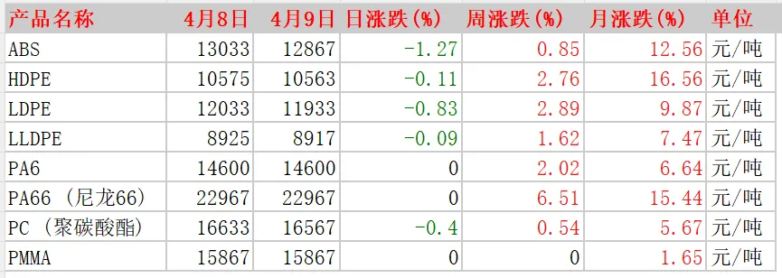 今日塑料报价(日、周、月涨跌)