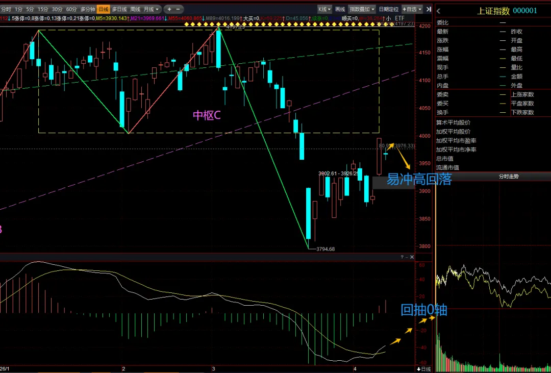 日线图,未能一鼓作气拉回中枢C,且缩量回撤,这里继续冲高易回落需回踩5日均线,不宜追高。