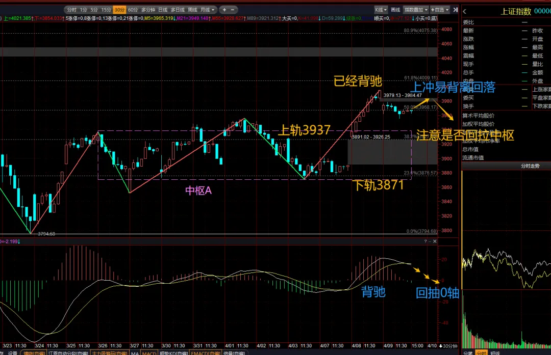 30分钟图,离开中枢A这一段已经背驰,这里关键点位3937(中枢A上轨),如拉回则后面会回到中枢震荡,需减仓等待,如不拉回3937,构成三买,则中枢上移,有望蓄力继续上攻。
