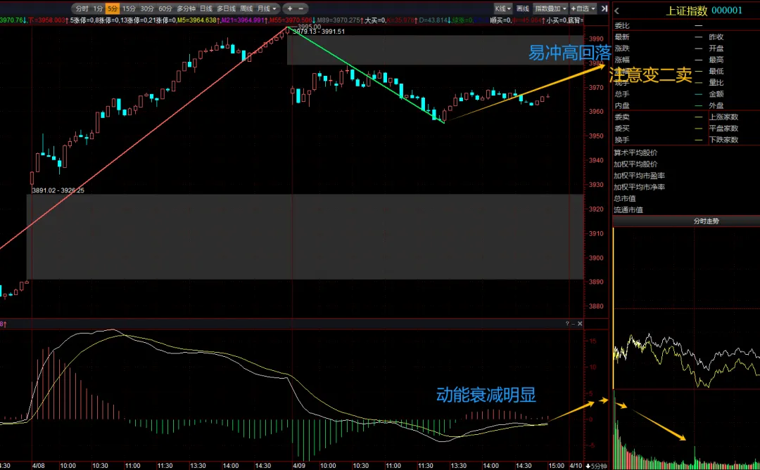 5分钟图,高位横盘回抽0轴,且超卖,今天观察力度,如创新高形成背离,仍是减仓机会,不能创新高又变为超买,注意变二买,也是需要减仓。