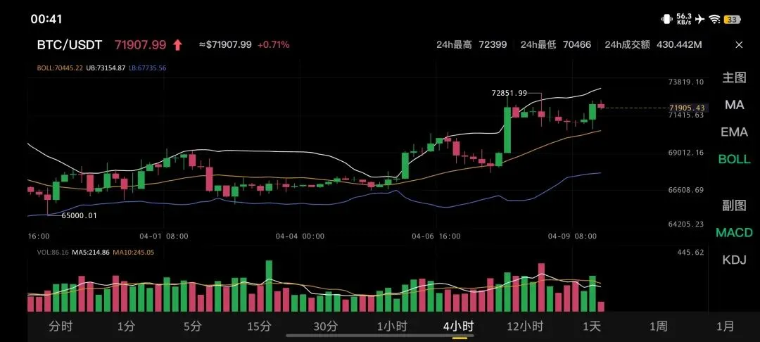 2026年4月10日比特币行情简单分析,比特币BTC/USDT当前价格约71907.99美元,24小时涨幅+0.71%,最高触及72399,最低70466。