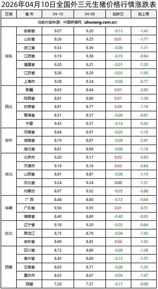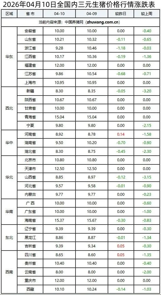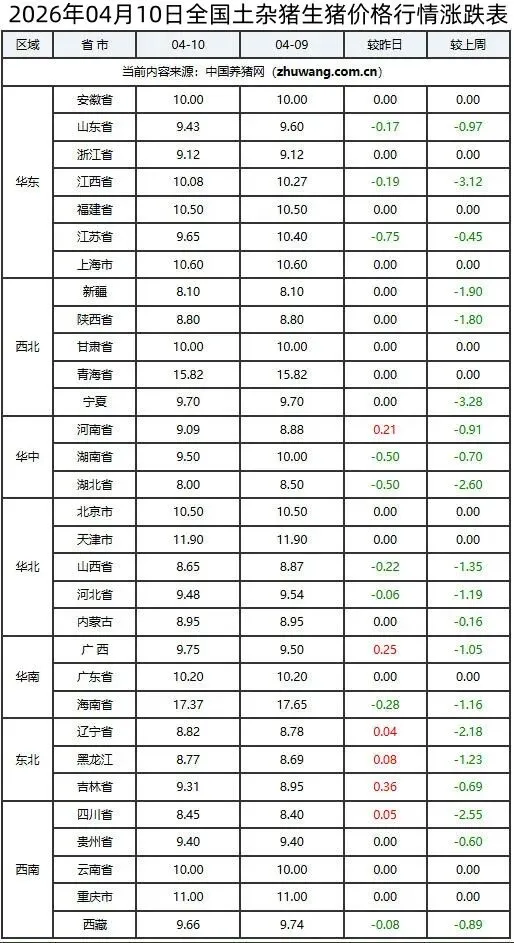 >2026年04月10日全国生猪价格行情涨跌表
