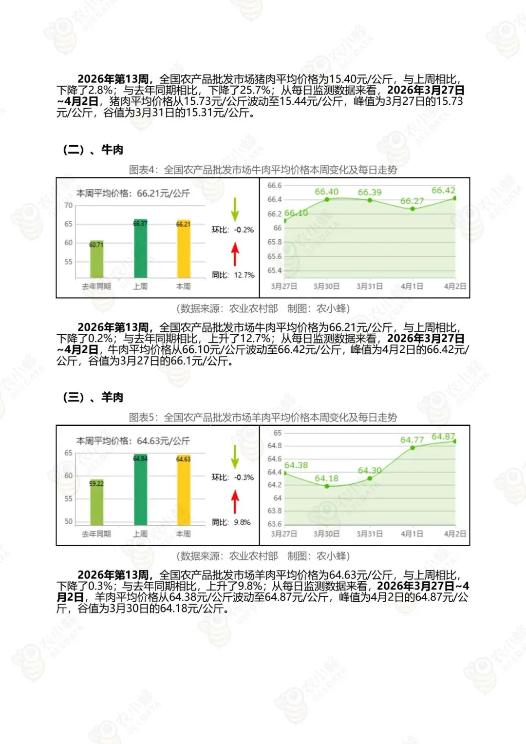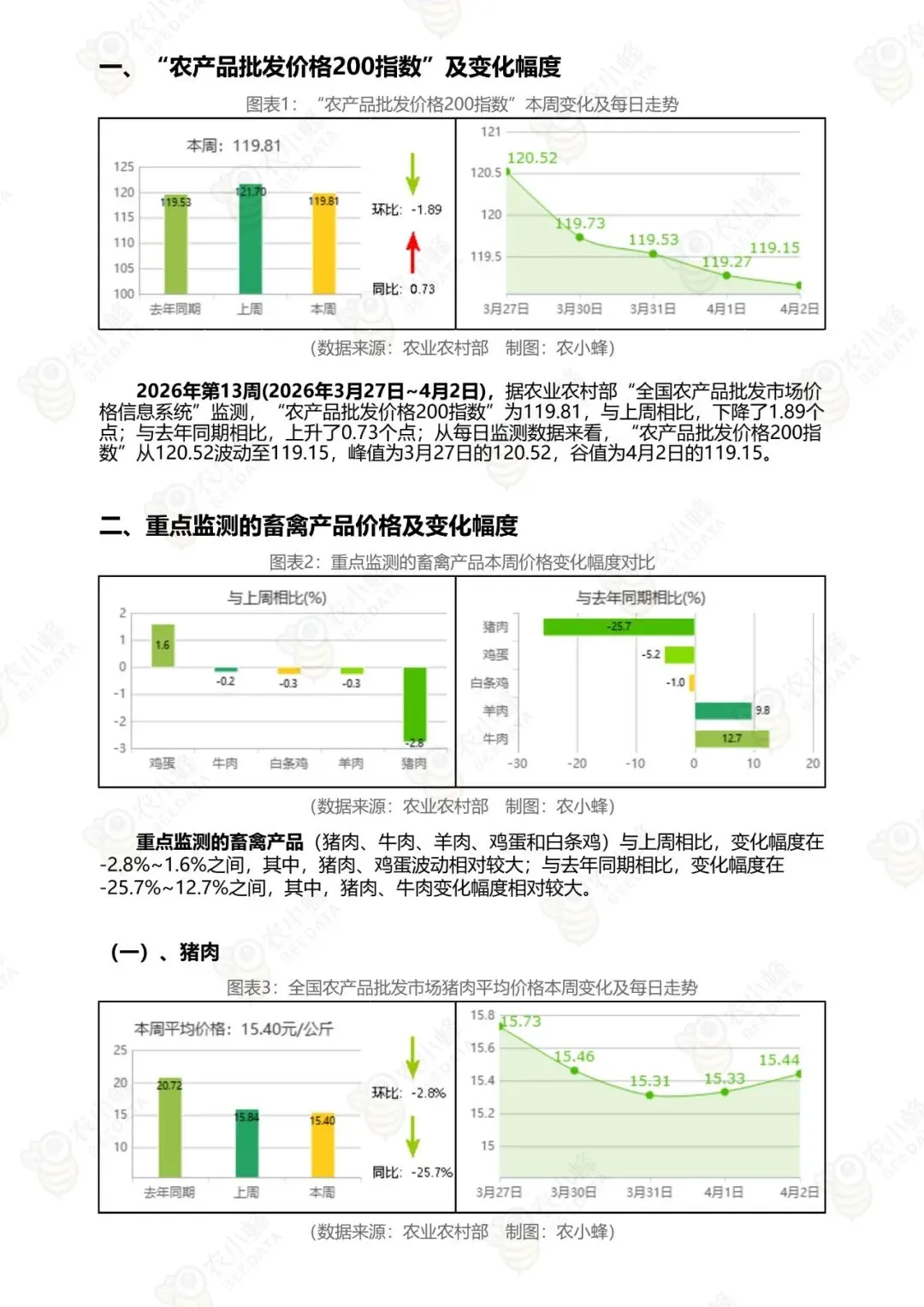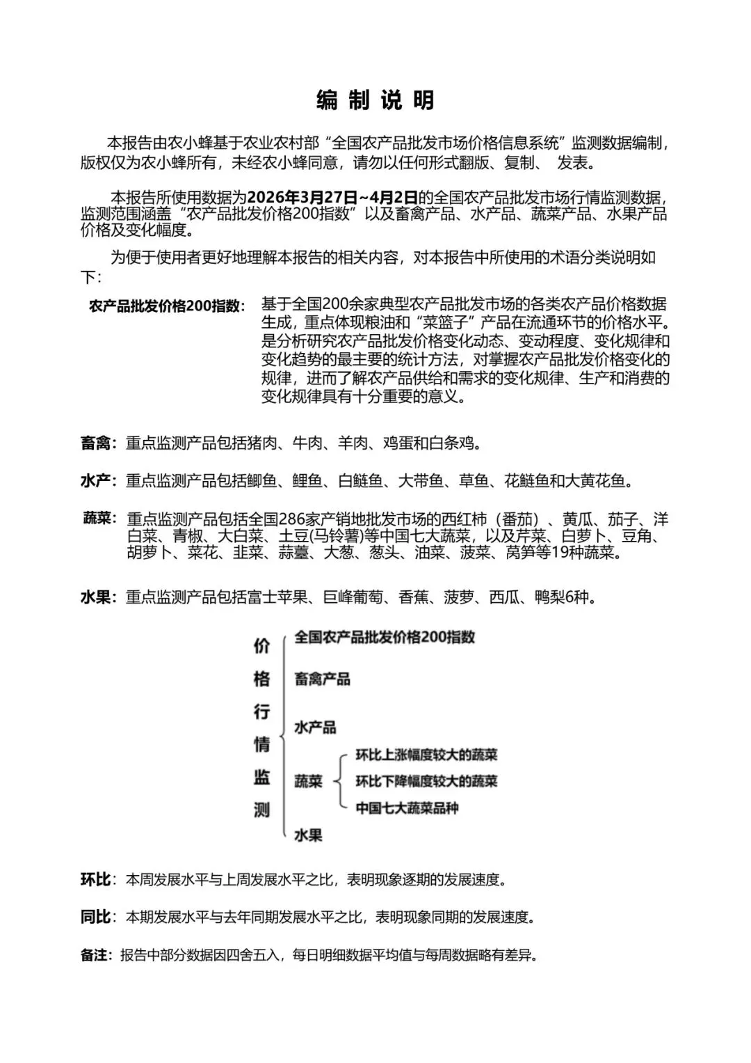 本篇分享的内容是《2026全国农产品批发市场价格行情监测报告》 本报告所使用数据为2026年3月27日~4月2日的全国农产品批发市场行情监测数据,