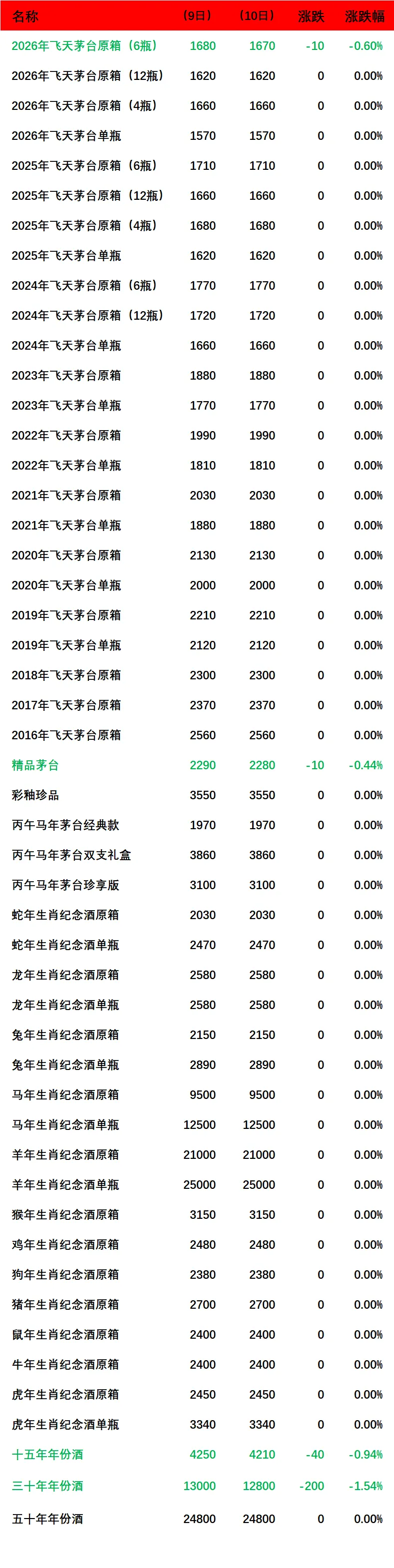 2026年飞天茅台原箱(6瓶),精品茅台和十五年及三十年份酒出现下跌。