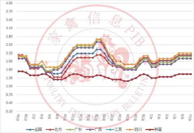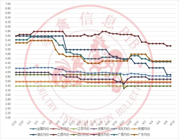 2026年2月25日-2026年4月10日主流地区白羽鸭毛鸭均价走势图