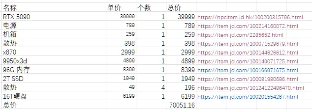 电脑配置:u7 | 9700x + 32G + 2T + RTX 5070Ti,成本在18000左右。