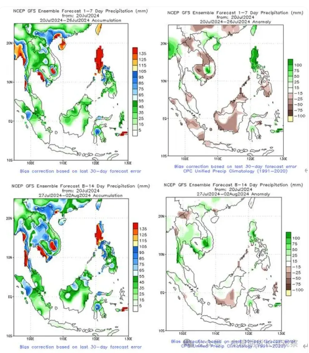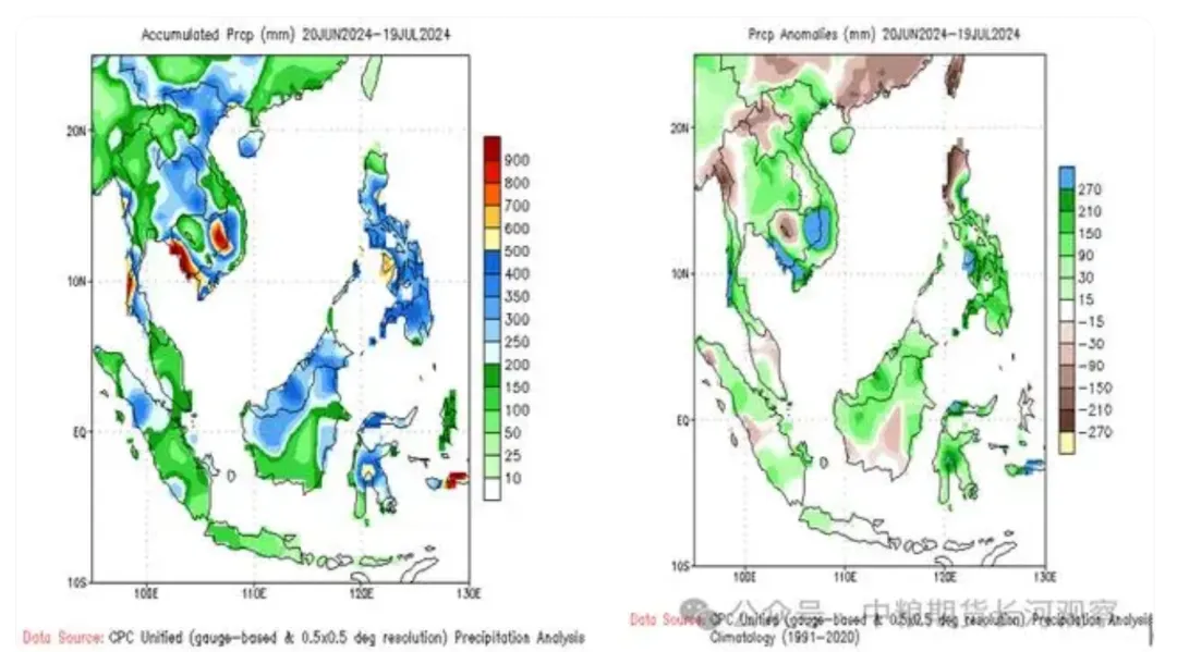 6月20日-7月19日马来降水整体较往年平均值高,印尼加里曼丹南部局部持平略低于往年平均,其它地区降水较往年平均值高。截至7月19日马来24度近月FOB报价897.5美元/吨,印尼报价897.5美元/吨;7月马来西亚出口表现强劲,印尼预计在6月集中出口后7月出口表现环比预计有所下滑。