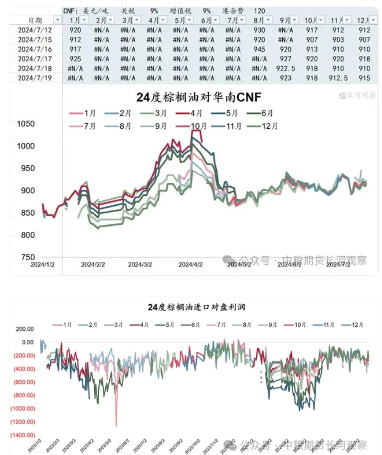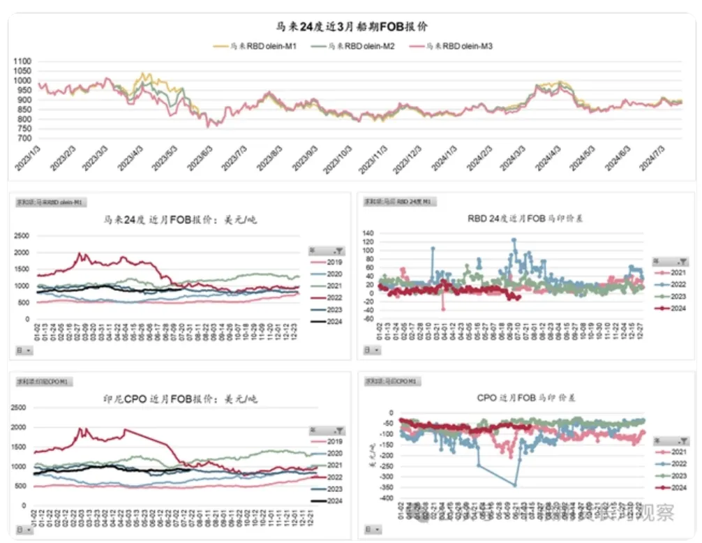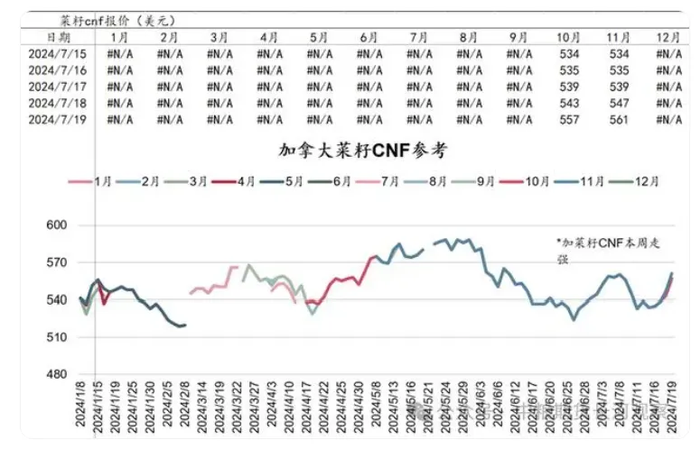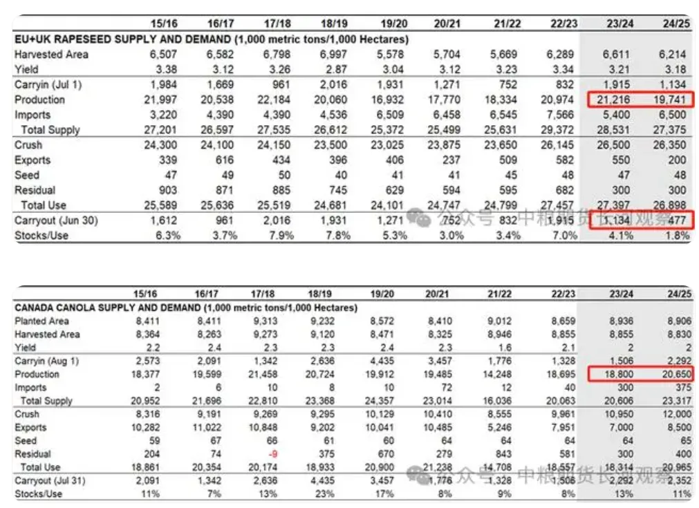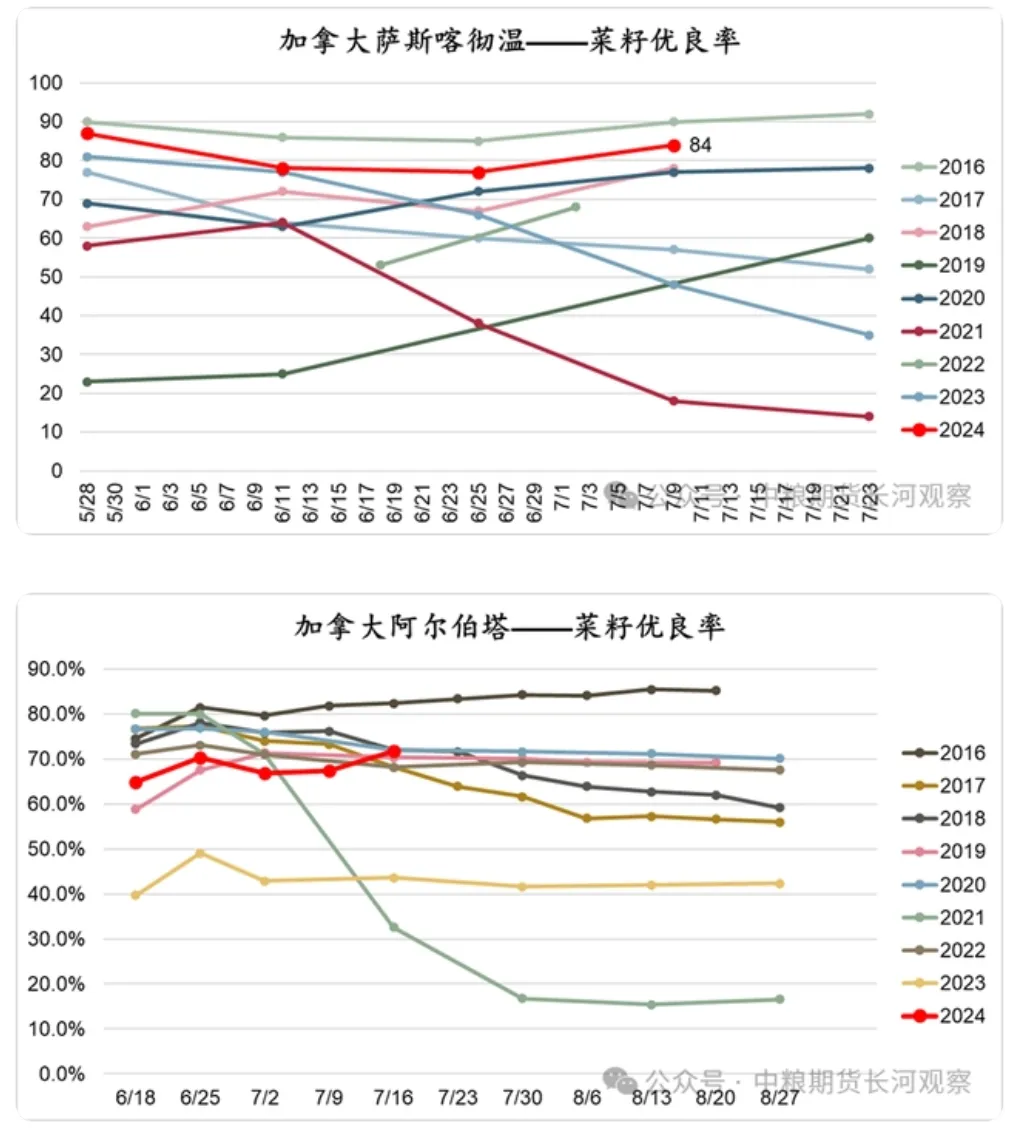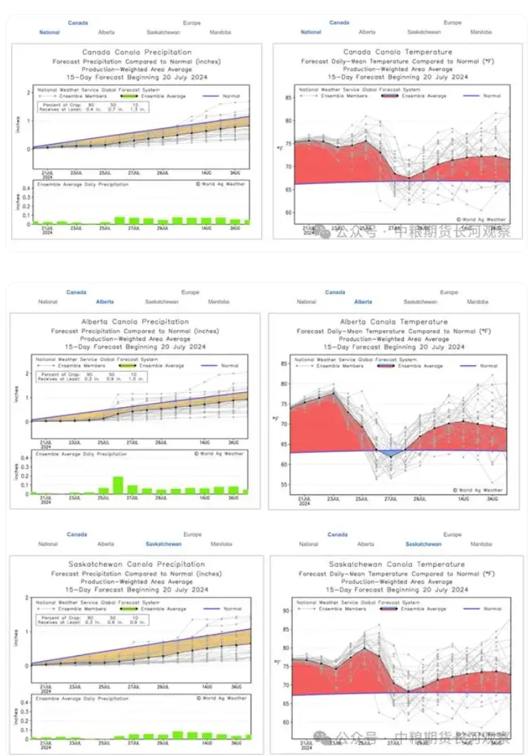 本周产区菜籽天气炒作,主要集中在加拿大天气表现预期方面,在今年欧洲菜籽减产背景下,部分欧洲需求可能转向加拿大,虽然从年度平衡表来看加拿大菜籽目前仍存24/25年度增产预期,但由于当下时间处于作物生长期,对于天气炒作的敏感性有所增强。从目前的优良率看,截至7月16日阿尔伯塔省菜籽优良率为71.8%,对比上周为67.4%,去年为43.6%,截至7月8日,萨斯喀彻温省菜籽优良率为84%,对比6月25日为77%,去年为48%;未来两周预报加拿大天气高温降水偏少,持续跟踪产量兑现情况,目前行情在资金市下情绪有所放大。截止7月18日,国际植物油脂出口市场仍以欧洲偏强,欧洲菜油报价小幅上涨至1117美元/吨,葵油报价1110美元/吨;南美豆油报价处于几大油脂中间水平,截至7月18日,阿根廷豆油近月报价944美元/吨,东南亚精炼棕油印尼报价898美元/吨,为目前相对有性价比品种。国际市场后期一方面关注欧洲油籽产量与需求情况,另一方面关注棕油产量因素。