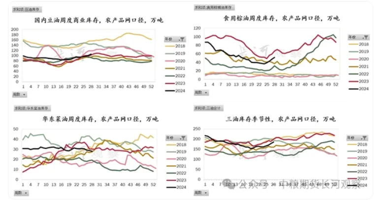 Mysteel数据,截至2024年7月12日(第28周),全国重点地区豆油商业库存106.11万吨,环比上周增加4.25万吨,增幅4.17%。棕榈油商业库存51.568万吨,环比上周增加4.26万吨,增幅8.99%;同比去年66.75万吨减少15.18万吨,减幅22.74%。华东地区主要油厂菜油商业库存约28.10万吨,环比上周减少0.75万吨,环比减少2.60%。三大油脂商业库存总量为196.528万吨,较上周增加8.525万吨,增幅4.53%;同比2023年第28周三大油脂商业库存208.49万吨减少11.96万吨,减幅5.74%。