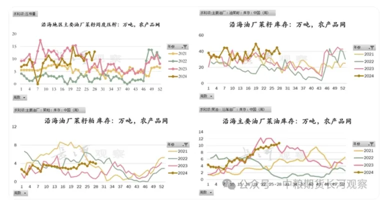 Mysteel数据,截至2024年7月12日第28周,沿海地区主要油厂菜籽压榨量为12.95万吨,本周开机率36.93%。沿海地区主要油厂菜籽库存37.2万吨,环比上周减少7.45万吨;菜粕库存3.95万吨,环比上周减少0.30万吨;未执行合同为24.7万吨,环比上周减少0.40万吨。菜油库存为10.75万吨,较上周增加0.5万吨;未执行合同为31.6万吨,环比上周增加0.6万吨。