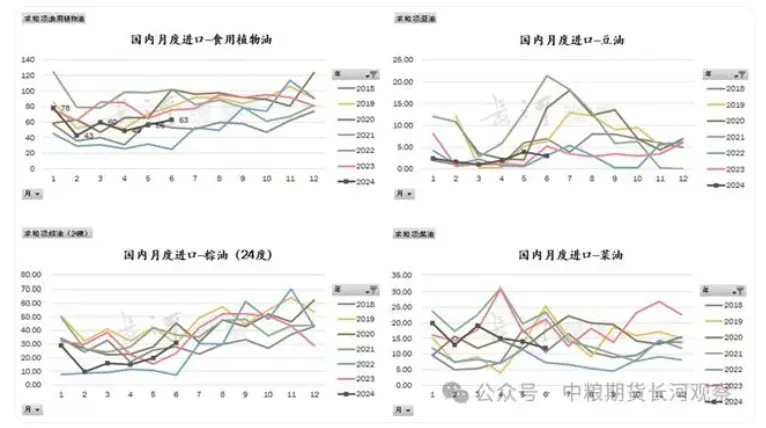 棕榈油进口量为31万吨,同比增加33.9%;1-6月棕榈油进口量累计为121万吨,同比下滑25.6%。 菜子油及芥子油进口量为12万吨,同比下滑42.9%;1-6月菜子油及芥子油进口量累计为94万吨,同比减少20.8%。 豆油进口量为3万吨,同比增加47.8%;1-6月豆油进口量累计为15万吨,同比增加2.4%。
