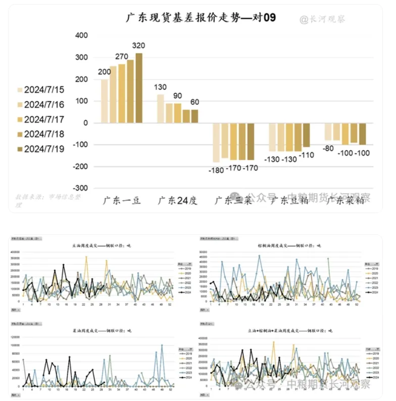 本周油脂基差分化,菜油表现底部,24度棕油受性价比走弱需求偏淡影响报价有所走弱,豆油受豆粕憋库及突发事件影响基差有所走强,截至19日周五,广东一豆现货基差报价09+320,24度报价09+60,三菜报价09-170。目前看三油供应预期兑现中,下游情绪偏低,从结构来看供需转松预期不变。现货成交方面,Mysteel数据,豆油周度成交12.71万吨,环比增加2.88万吨;棕榈油市场成交2050吨,环比减少430吨;菜油市场本周成交10000吨,对比上周增加5000吨。油脂市场三大油成交总量环比增加3.337万吨,在供应恢复预期、基差弱势的基本面下,下游情绪偏淡。