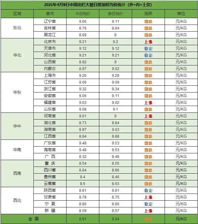 2026年4月9日,中国主流市场出栏外三元、内三元及土杂商品大猪加权日均价较昨日价格下跌,全国生猪出栏加权日均价8.91每公斤,较昨日价格下跌0.33%。当前市场仍处于供应过剩、消费淡季的状态,猪粮比持续偏低,养殖端深度亏损,养殖端抗价与屠宰端压价形成僵持,短期猪价难有大幅反转,整体以低位震荡磨底为主。今日全国外三元、内三元及土杂猪均价如下:1) 主流市场外三元大猪全国销售均9.02元每公斤,较昨天价格下跌0.40%;2)主流市场内三元大猪全国销售均价8.65元每公斤,较昨天价格下跌0.05%;3)主流市场土杂大猪全国销售均价8.25元每公斤,较昨天价格下跌0.45%。