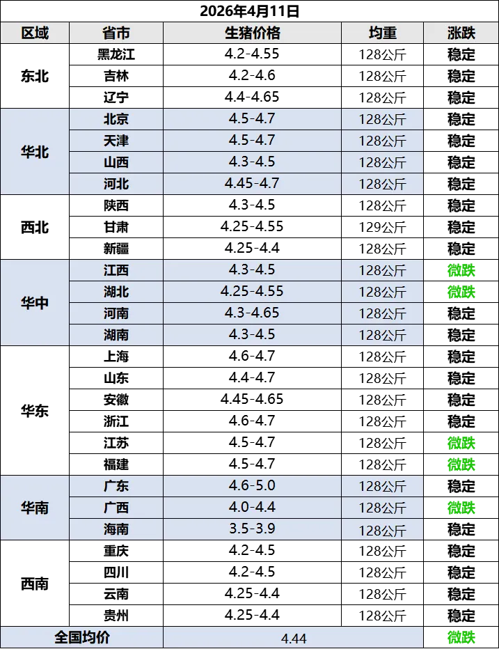根据统计的猪价,计算出2026年4月10日全国平均猪价为每斤4.43元,比昨天下跌0.03元,跌幅为0.70%,连续3天下跌,累计下跌0.07元,不仅跌至今年以来最低价,还是自2019年以来最低。