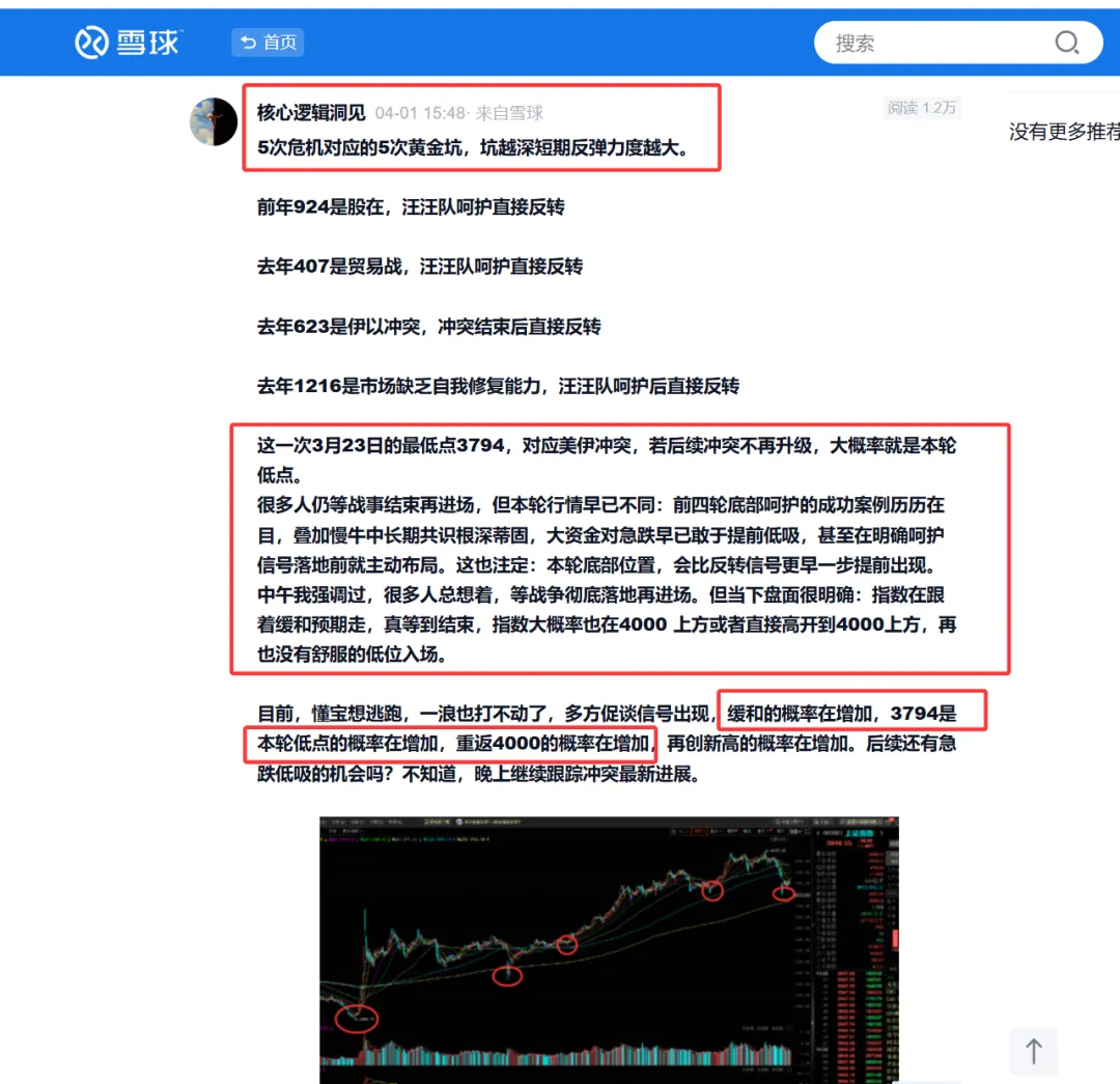 核心逻辑:前年9月24日和去年4月7日的底部与反转点位是重合的,是当时市场对汪汪队的呵护预期不强甚至没有。而去年12月16日的底部,市场对汪汪队的呵护有预期,因此在呵护之后反转预期高度一致,指数走出17连阳。而这一次,市场对汪汪队的呵护预期更强烈,所有人都清楚,即便出现黑天鹅也会有托底呵护。在人造牛格局下,只要呵护出现,市场必然反转。因此,我在4月1日明确强调:前四轮底部呵护的成功案例历历在目,叠加慢牛中长期共识根深蒂固,大资金对急跌早已敢于提前低吸,甚至在明确呵护信号落地前就主动布局。这也注定:本轮底部位置,会比反转信号更早一步提前出现。缓和的概率在增加,3794是本轮低点的概率在增加,重返4000的概率在增加,再创新高的概率在增加。说白了,这是市场对呵护预期,从分歧走向一致的过程。呵护预期越强,指数走势越稳,短期恐慌性急跌、大跌都是低吸机会。而且A 股资金向来喜欢卷预期、抢先手:你想等战争结束再入场,可只要有呵护预期在,自然有人敢比你更早抄底。