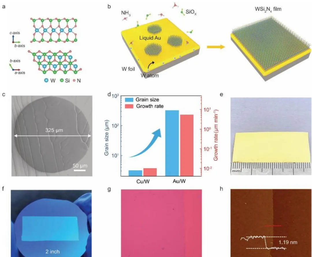 研究团队创新采用液态金 / 钨双金属薄膜衬底工艺,成功实现晶圆级单层 WSi₂N₄薄膜的可控生长,材料单晶尺寸与生长速率大幅提升,该材料空穴迁移率高、稳定性好,在晶体管应用中表现突出,为二维半导体用于 CMOS 集成电路开辟了新方向。