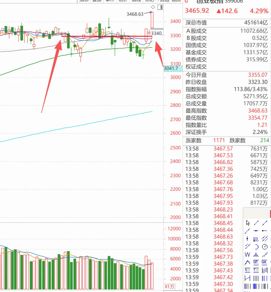 4、我判断,创业板下周很大概率,短线会尝试去突破3520点,如果遇阻的话,就会出现3340点到3520点之间横盘震荡,长线趋势则是震荡向上。