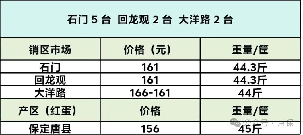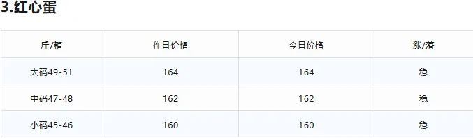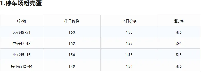 1.今日停车场粉壳蛋各规格价格涨幅5元,红壳蛋、红心蛋各规格价格保持持稳。2.昨日市场成交量 全天走货车46辆左右(粉蛋)1号停车场存量 13辆(粉蛋)今日到车数量 30辆(粉蛋)市场走货情况 目前市场走货速度正常大洋路 2 台,价格 166-161 元,货继续少,没有剩车,明天回车预计 4-5 台附近。三.我司现货采购数据