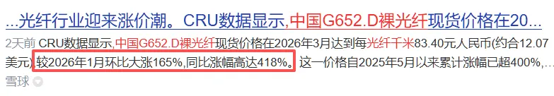 CRU权威数据实锤,数据震撼到离谱。中国G652.D裸光纤,3月报价83.4元/光纤千米,较1月暴涨165%,同比更是狂涨418%!自2025年5月起,累计涨幅超400%,直接冲破历史峰值,创下行业新纪录!