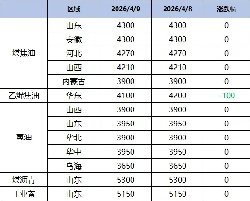 本周煤焦油涨跌互现,区域差异明显,主流地区成交价格在4210-4300元/吨。乙烯焦油价格下调100元/吨,蒽油暂稳。