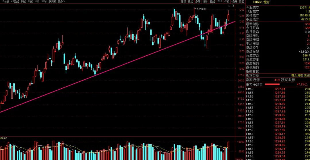 - 目前盘面主线依然清晰,锂矿板块走势依然较为稳健,建议留意该板指走势,只要主线不倒,牛市格局就不会出现太大偏差,对目前交易来说,这是盯盘星,因为锂矿板块走强,很容易带动中游的电解液等、下游的新能源汽车等走势,覆盖和影响的个股很多,对激活和带动市场人气有非常大的影响。