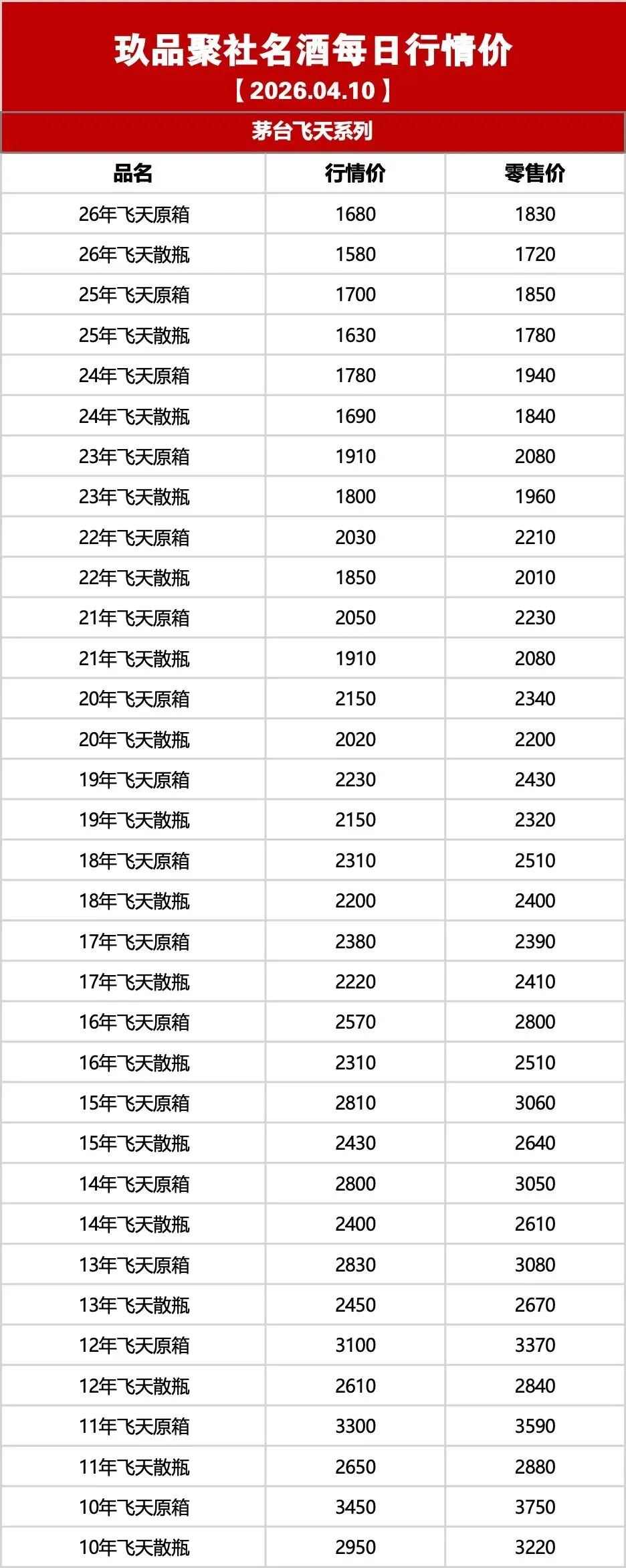 玖品聚社名酒行情:2026年04月10日名酒出货行情价