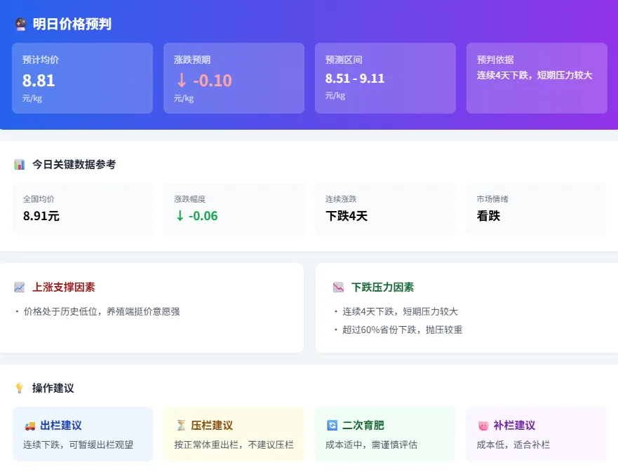 🔗 产销价差分析:猪肉(16.98) - 生猪(8.91) = 8.07元(价差率90.5%)。价差率较高,屠宰利润丰厚,但终端消费承压,需警惕价格回调风险。