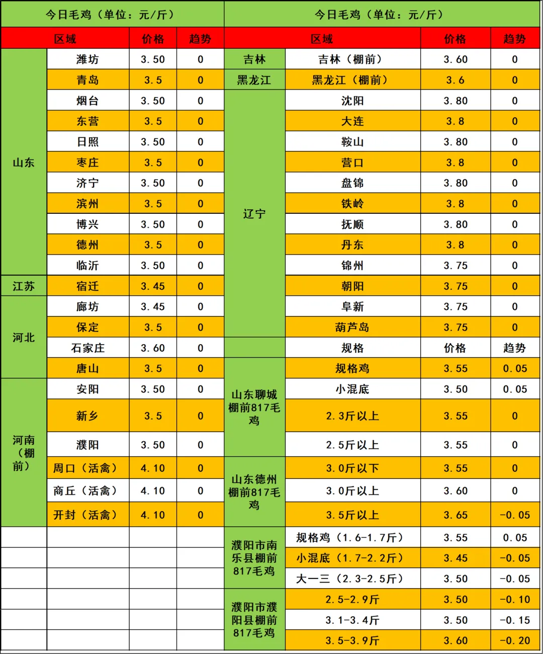注:各地毛鸡以实际成交为准,其中活禽交易价格差异大。实际局部根据产品行情、消费、毛鸡出栏现状分析,实际收购价格与报价有一定差距,价格只供参考。