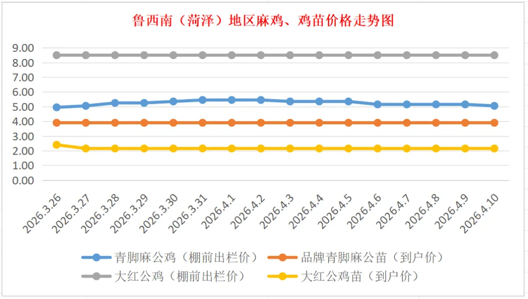 品牌青脚麻公苗(多品种快大型):价格稳定,到户价4.50元/羽,稳。