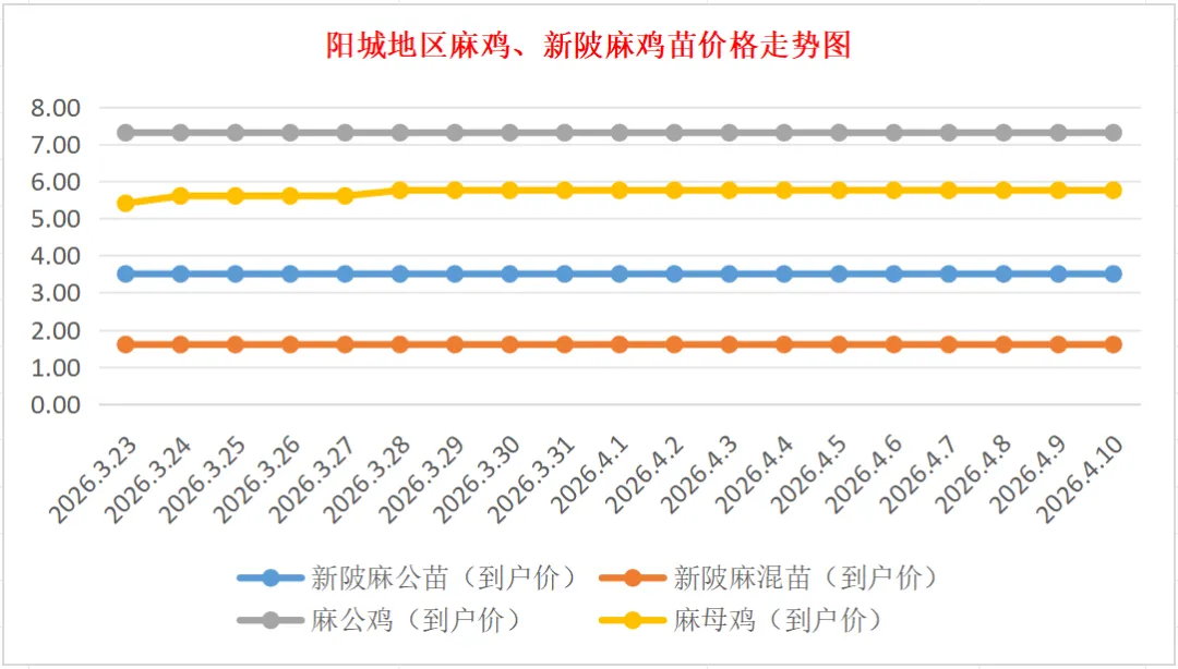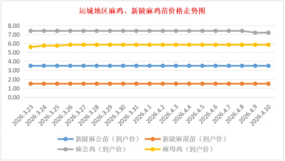 普通新陂麻:价格稳定,到户价公苗4.00元/羽,稳。