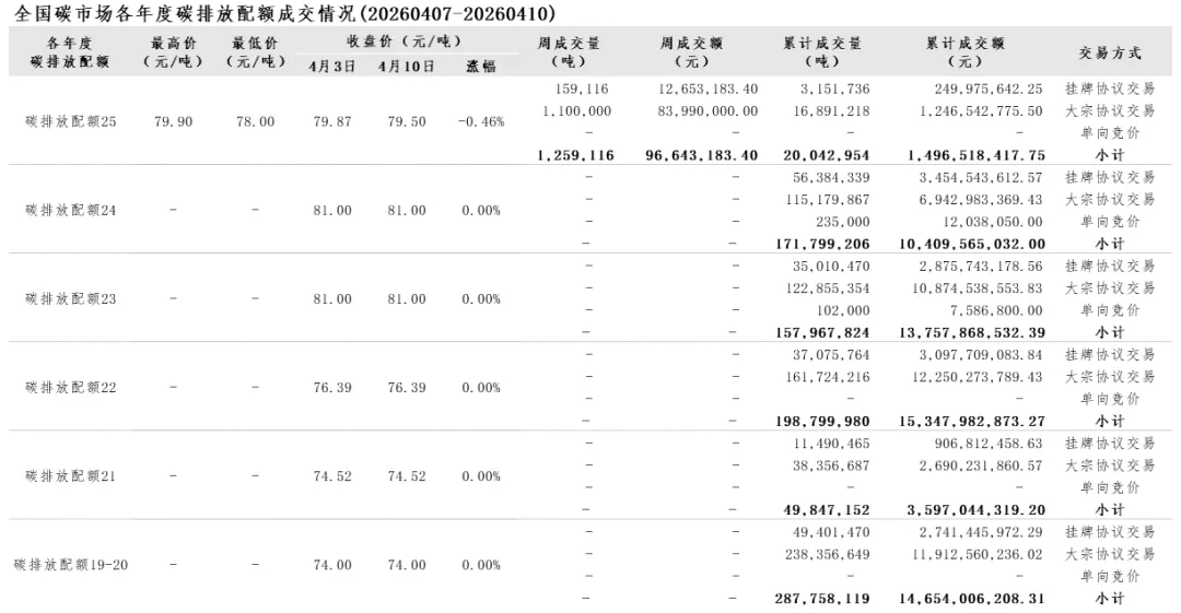 2026年1月1日至4月10日,全国碳市场碳排放配额成交量21,348,715吨,成交额1,600,367,151.35元。